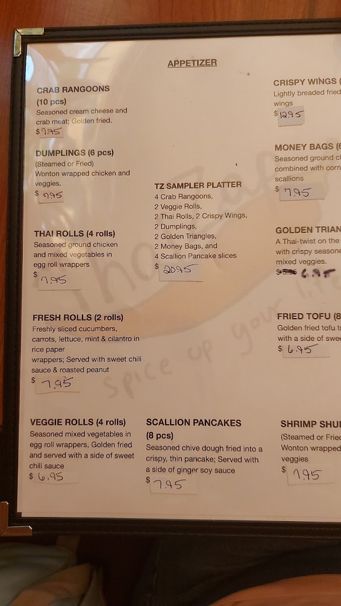 Four crab rangoons, two veggie rolls, two Thai rolls, two crispy wings, two dumplings, two golden triangles, two money bags, two shrimp shumai and four scallion pancake slices with accompanying sweet chili and ginger dipping sauces .
