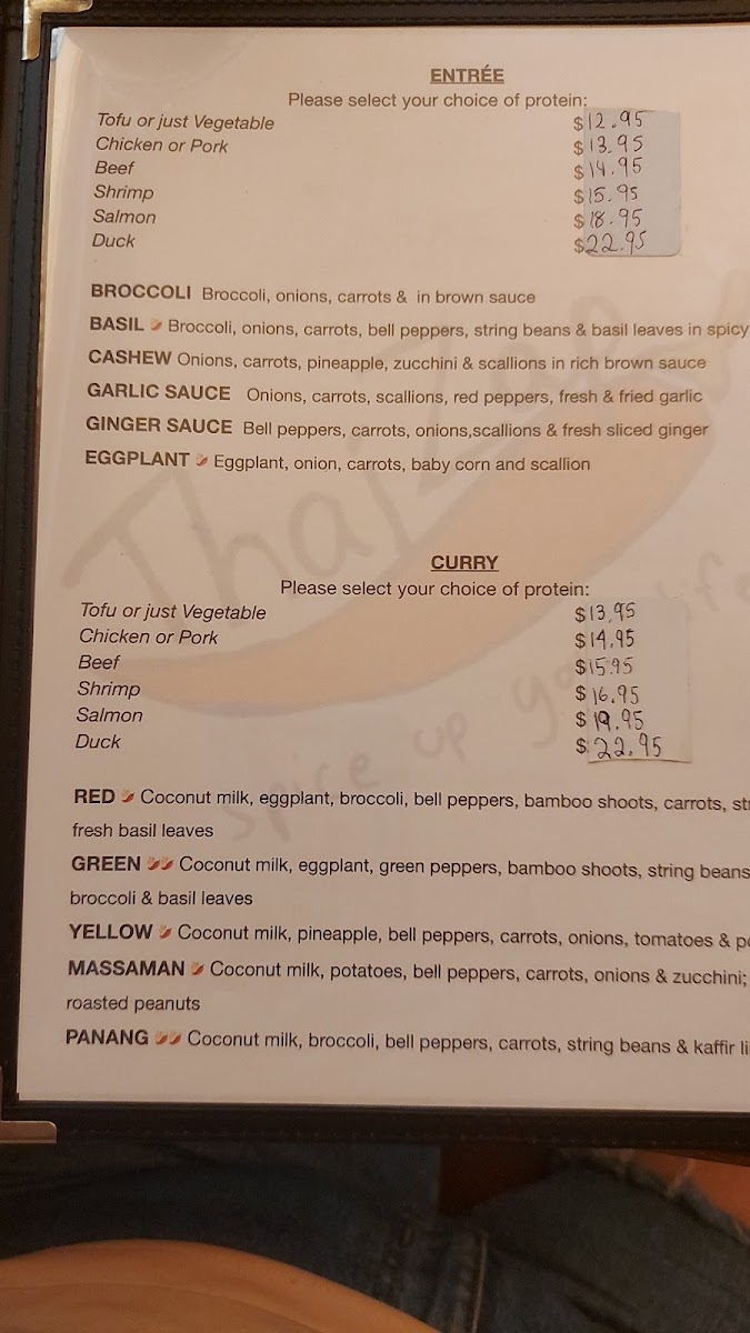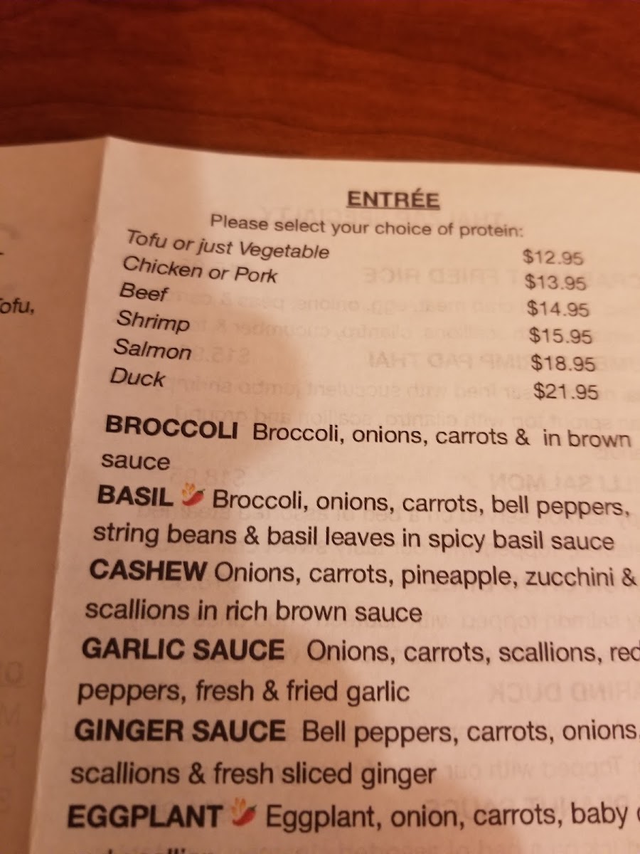 Spicy -Deboned sautéed duck with choo chee curry paste on a bed of assorted steamed vegetables.