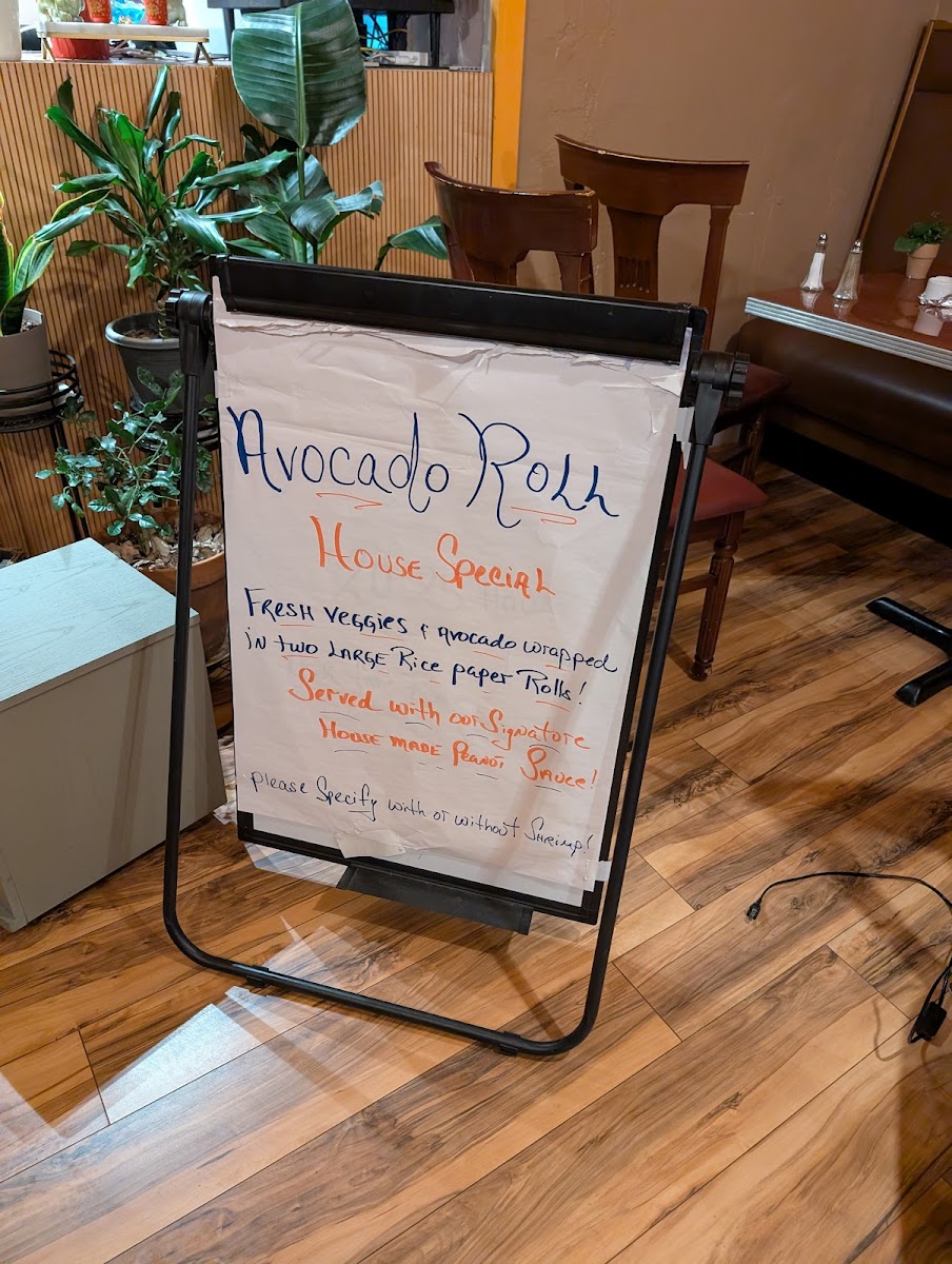 Made fresh to order . Two large rolls of Shrimp, avocado, lettuce, shredded carrots, mint leaves , basil and cucumber wrapped in rice paper with an accompanying signature home made creamy peanut butter dipping sauce .